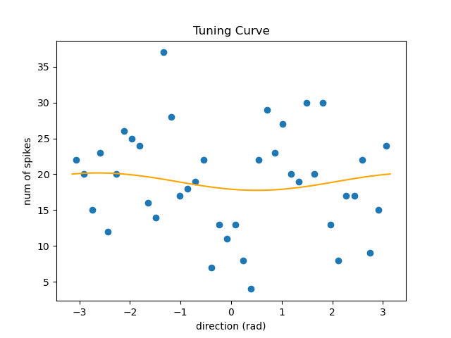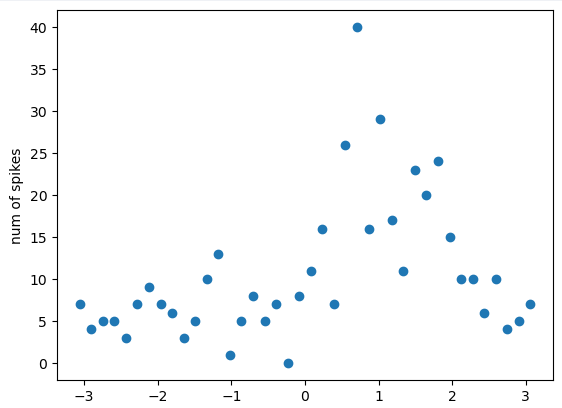 为了对抗这种类型的噪声,参考之前的学长留下的代码,对角度划分一定数量的 bin。对 bin 范围内的脉冲发放数进行累加,每个 bin 用其中心的角度值代表。这样得到的数据分布呈现出更明显的趋势。