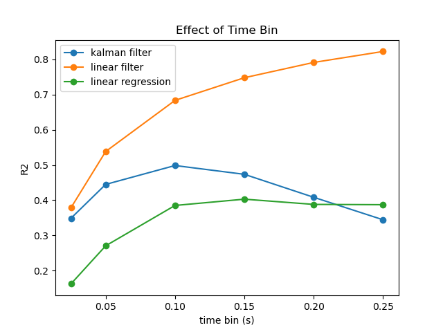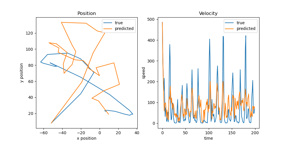 取时间 bin 为 0.1s,Linear Filter 的历史窗口为 5 个 bin(0.5s),运动数据和神经数据之间的延迟为 2 个 bin(0.2s),测试拟合效果。