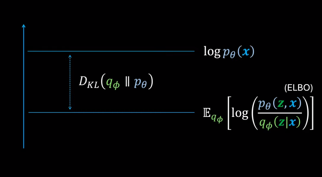 令$\text{ELBO}:=\mathbb E_{z \sim q(z|x)}\left[ \frac{p(z,x)}{q(z|x)} \right]$。观察到 KL 散度总是正的,$\log p(x)$总是负的,那么一定有$\text{ELBO}<=\log p(x)$。RHS 在贝叶斯推断中称为证据(evidence),因此前者被称为证据下界(Evidence Lower Bound, ELBO)。对于同一个$x=D$而言,证据是不变的,因此最小化 KL 散度就等同于最大化 ELBO。ELBO 一般是可计算的,从而把一个后验分布的求解转换成了优化问题。 #theorem