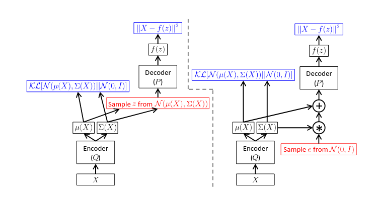 其中第一项实际上是重构误差,第二项的含义是让每一个样本的$p(z|x_i)$都靠近$\mathcal N(0, I)$。一方面可以从 KL 散度的含义看出来,另一方面可以将后一项 loss 拆成$(\mu_i^2)+(\sigma_i^2-\log(\sigma_i^2)-1)$。理想情况下,前后两项都下降为 0,此时前一项得到$\mu_i=0$,后一项得到$\sigma_i^2=1$。苏剑林的解读中认为这一项在计算建模中的意义是防止模型将$\sigma^2$调整成 0 从而退化到 auto encoder,同时保持模型的生成性质,即从$\mathcal N(0, I)$中采样可以对应到所有的图像。