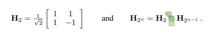 它是一个单位正交阵,标绿的算子代表克罗内克积。QuaRot 在此基础上,对每一行随机地乘上 1 或者 -1,即乘上一个由${1, -1}$构成的对角矩阵。容易验证这也是一个单位正交矩阵,因为这个操作既不会改变行向量的长度(单位长度),也不会改变行向量之间的正交性。
